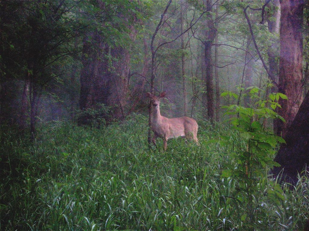 As the sun reached the top of the trees, the fog across the field began to thin. Soon a big doe trotted past and then stopped in front of me. My hand slid toward my breast pocket where my point-and-shoot camera was stored. I eased it out and managed to get one exposure before the doe continued across and entered the trees a couple of rods to my left.