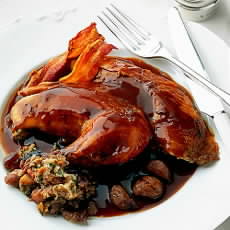 Combine flour, salt, paprica, pepper, and basil. Coat pheasant with seasoned flour. Heat shortening in a heavy skillet. Brown pheasant on all sides. Add garlic, olives, water, and Worcestershire. cover and simmer another 45 minutes. Turn pheasant and add wine. Cover and simmer another 45 minutes. Add more water to make extra sauce.
