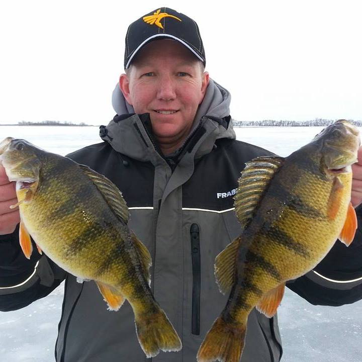 Team Outdoorsmen Adventures member Eric Brandreit, Big Stone City, S.D., a true believer in the run and gun method with some of the perch taken while fishing out of his Frabill Citadel ice shelter.