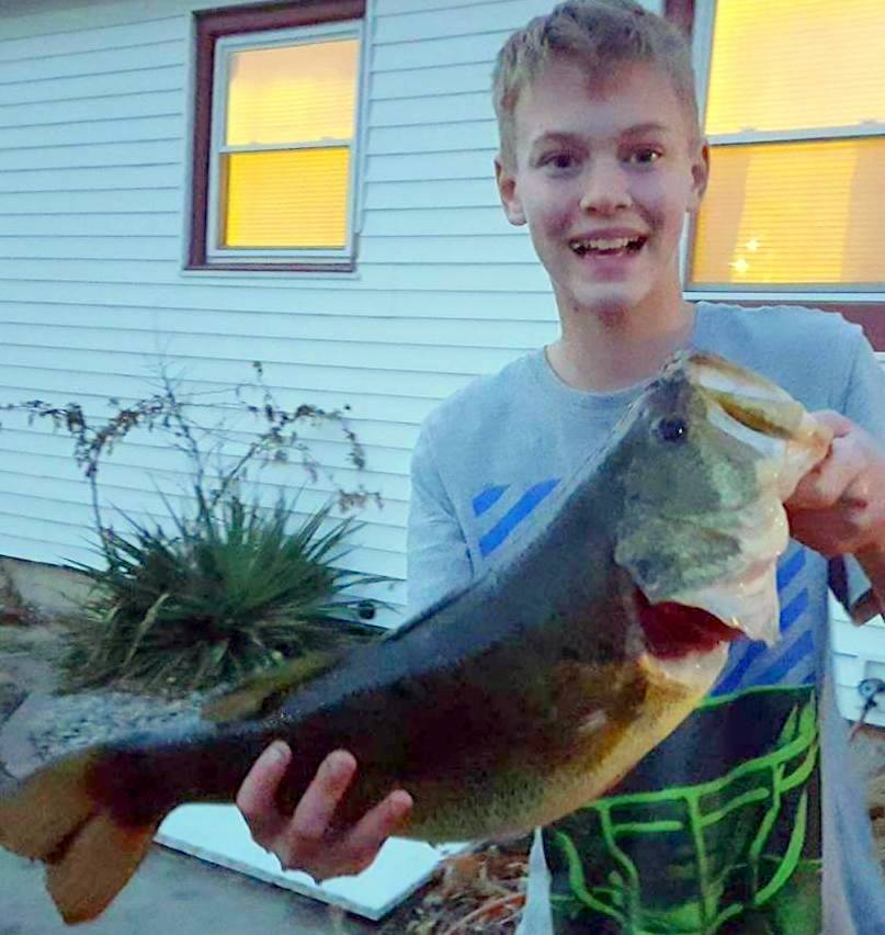 Dayton Kadavy, Hartington, Neb. with a big bass, a 5.3 pounder he took from a small pond using a spinnerbait.