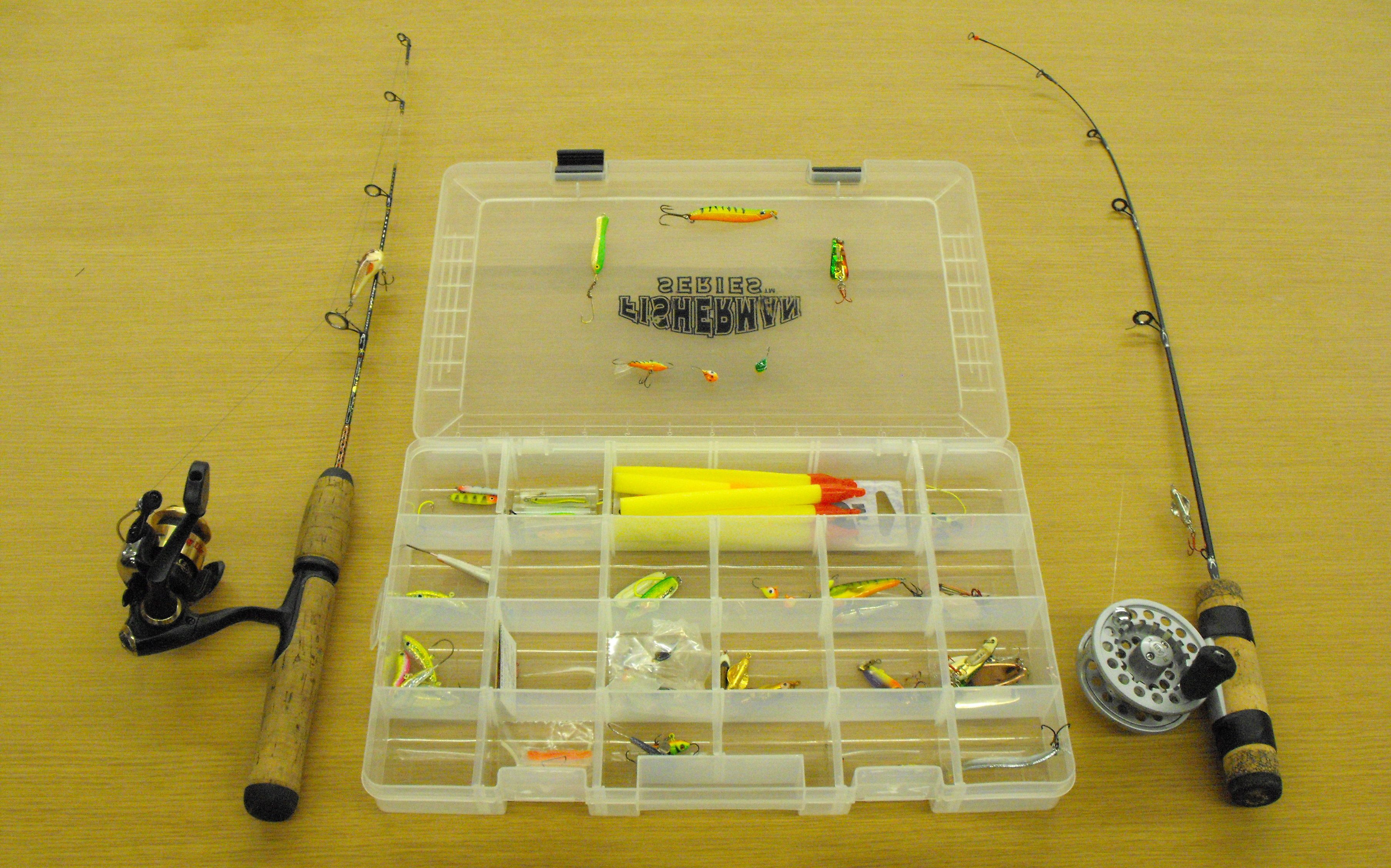 Ice fishing gear has changed with early equipment being one-size-fits-all to today’s species-specific spinning reel rigs (left), spooler reels (right) with lures in numerous sizes from the mini lures used for panfish to the larger spoons for pike and colors ranging from flashy to fluorescent.
