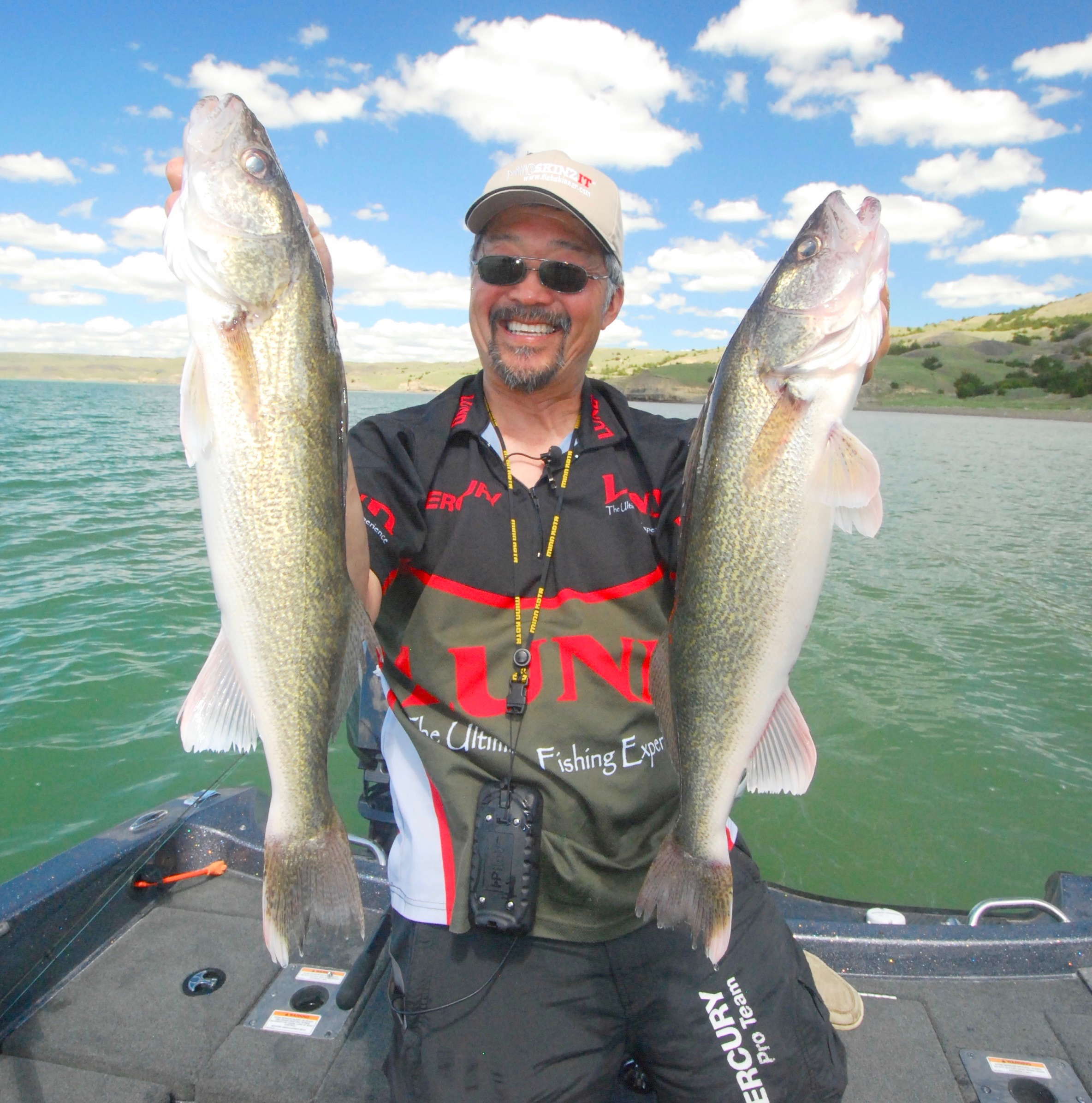 Professional angler Ted Takasaki, Sioux Falls, South Dakota with two of the three- man walleye limit caught when he, Team Member Larry Myhre, Sioux City, Iowa and the author fished Lake Francis Case using the Mack’s Lure Smile Blade spinners Slow Death Rig. (Larry Myhre Photo)