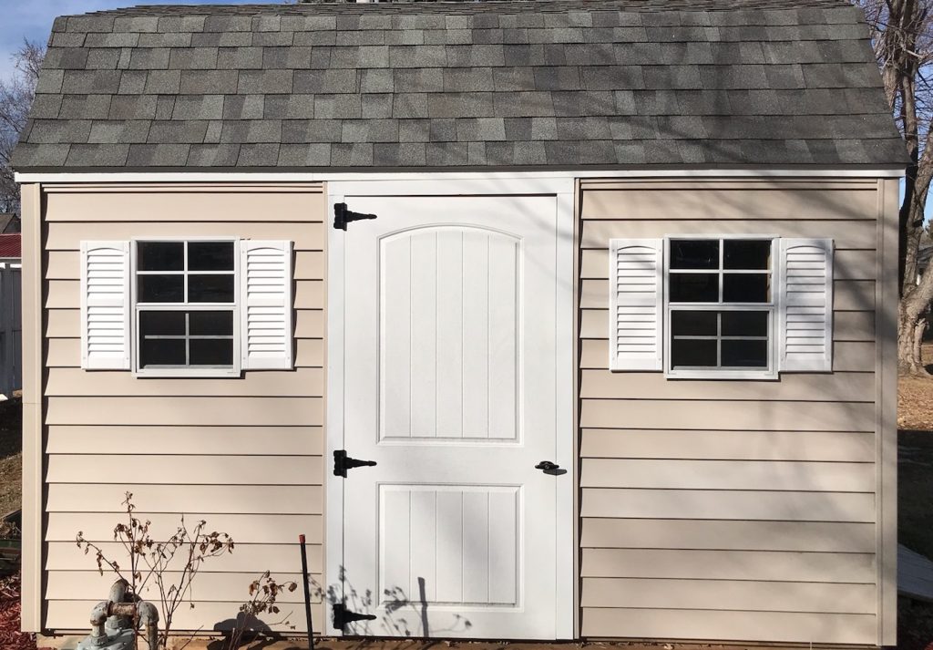 My 10 X 12′ building had vinyl siding, a walk in door, a window on either side of the door with shutters.