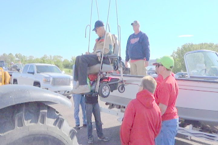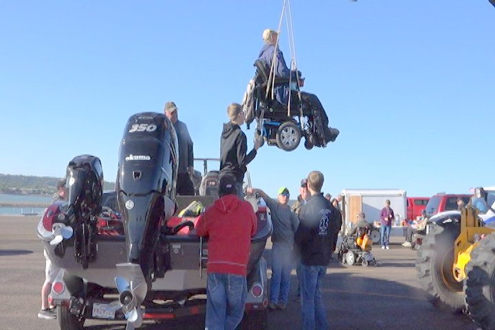 One of the attendees to the Fishing event being transported in his wheelchair from the ground up into the boat that will allow him to go walleye fishing on the Missouri River. (Outdoorsmen Productions Photo)