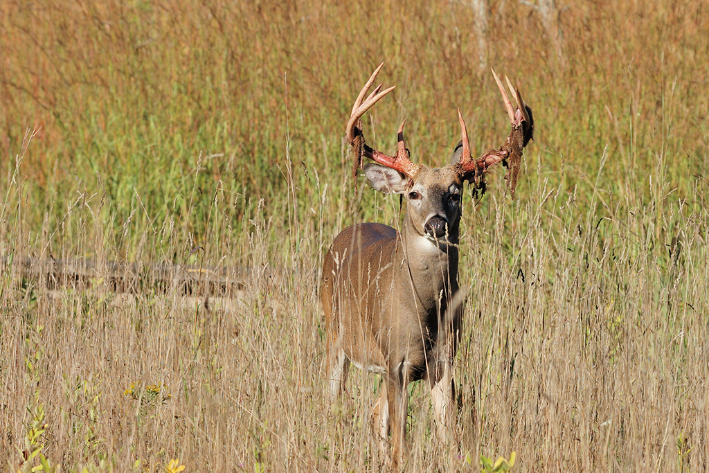 With the days of late summer getting shorter, testosterone levels begin to rise and the growth cycle begins to slow down initiating the process of hardening or mineralizing of the antlers. So how does the velvet come off? The velvet ceases to be fed by blood by the formation of what some call the base or the burr on the antler. When the buck grows this burr at the end of the antler cycle, it puts a “kink in the hose” so to speak, cutting off the blood supply to the velvet. In as little as a few hours the drying velvet is rubbed off and the buck is left with a blood-stained rack that he will continue to polish for several days. I think many early fall rubs that are seen are areas where bucks use saplings and bushes to scrub the drying velvet from their newly hardened set of antlers. It can also be eaten off by other deer or birds and any velvet that does hit the forest floor is quickly scavenged by mice and other critters because of its high nutrient content.