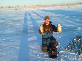 We also have spent a lot of time further west fishing in the Webster area, when our Team member and guide Cory Ewing, Waubay Lakes Guide Service fishing both on the ice and during the open water season and to say that he knows the lakes in the area, is an understatement as Cory is on the water a lot, maybe even more that at home, so he’s in the know when it comes to that area, and has ice fishing shelters on the ice in numerous lakes in that area, you can contact him at (605) 929-3894.