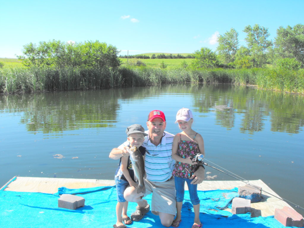 Gary Howey, Hartington, Neb. with his grand kids Braedon and Ashlynn Howey when they were younger with a largemouth bass they caught along the edge of the shoreline weeds. (Cassie Howey Photo)